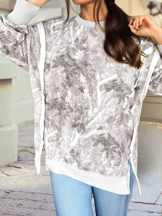 2025 Fall Leafy Contrast Trim Patchwork Slit Sweatshirt
