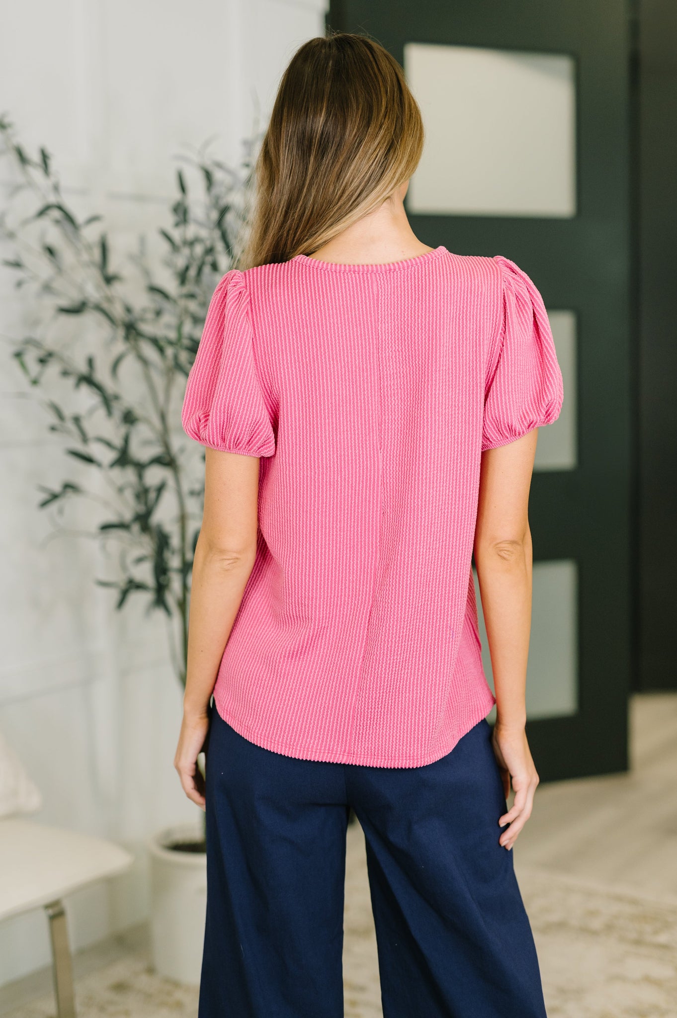 The Grace & Virtue Balloon Sleeve Blouse in Ocean Blue features a cable ribbed knit construction with stretch for comfortable all-day wear. This elegant piece showcases a classic round neckline, voluminous balloon sleeves with gathered cuffs for a refined silhouette, and a distinctive back center seam detail. Perfect for layering or wearing solo, this versatile blouse transitions effortlessly from casual to polished occasions.