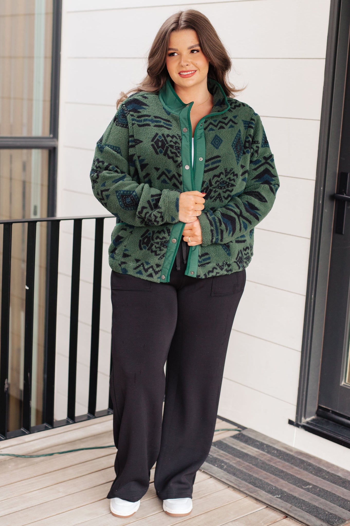 Stay cozy and stylish with our High Perspective Geometric Fleece Jacket! Made with soft polar fleece and featuring a snap front, front pockets, and a mock neckline, this fleece will keep you warm and looking trendy. The contoured seams and dropped shoulder add a touch of uniqueness to the classic geometric pattern.